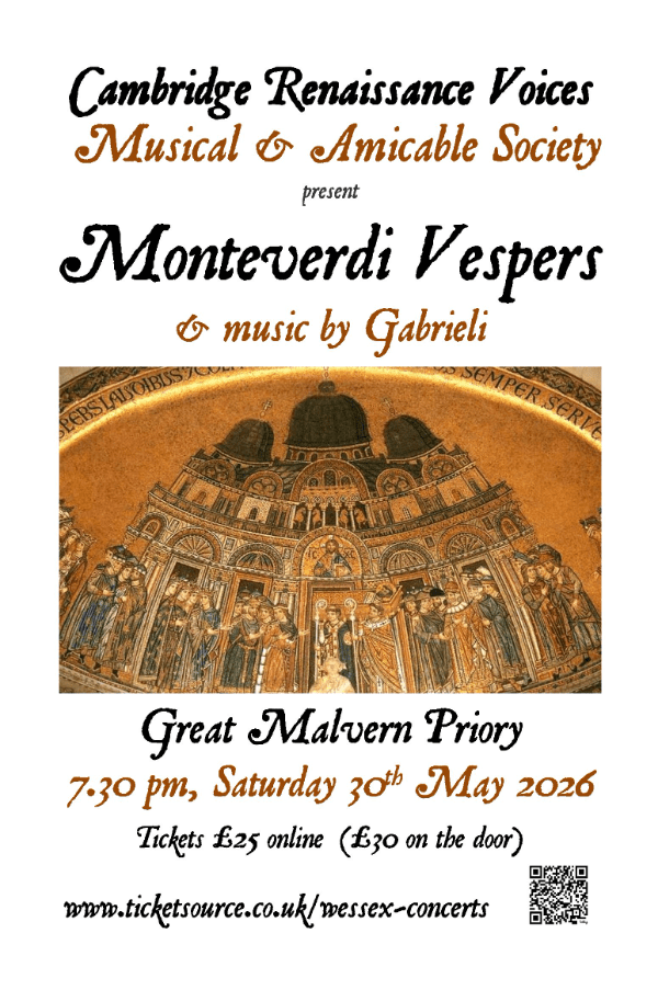 Cambridge Renaissance Voices and The Musical and Amicable Society will be performing Monteverdi’s Vespers of 1610, alongside works by Giovanni Gabrieli, at Great Malvern Priory on Saturday 30th May 2026.
